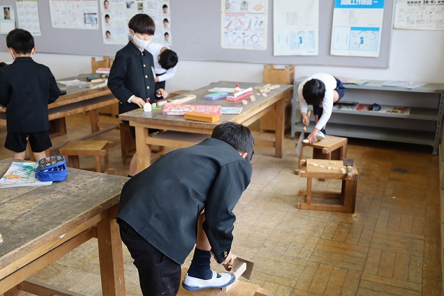 3・4年生は図工の時間に木材を使った作品を作っています。そこで使う道具がのこぎりです。日頃使うことのない道具に苦戦しながら、木材を足でしっかり固定して、のこぎりを引いていきます。なかなかスムーズには行きませんが、切り終わったときの満足そうな表情!断面を紙やすりで整えたあとは、自分が考えた設計図を見ながら、木材をボンドでくっつけていました。どんな作品に仕上がるか、出来上がりを楽しみにしたいと思います。