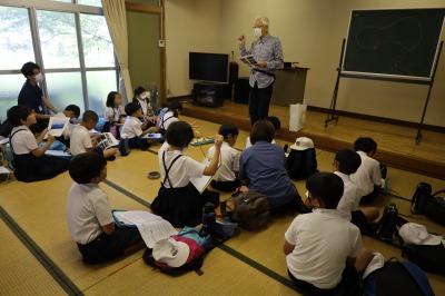 島に着くと、はじめに佐合島にお住いの案内人の方からお話を聞きました。本土からの距離、島の面積や人口、地形や主な建造物等について、丁寧にお話してくださいました。行ってみたいところをみんなで出し合い、いよいよ探検に出発です。