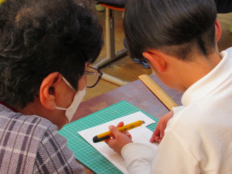【1月21日(火)】2年生は、図工の時間にカッターナイフを使った工作にチャレンジします。初めて使うカッターナイフに、子どもたちは不安と期待でドキドキです。子どもたちが安全に気を付けてカッターナイフを使えるようにと、なんと9名ものボランティアの方が学習支援に来てくださり、ほぼマンツーマンの状態で学習することができました。刃の出し方や使い方などの基本的な約束事を確認した後、直線、ジグザグ線、曲線など、少しずつレベルアップしながら丁寧に学習を進めていきました。話をきく時も作業をするときも子どもたちは真剣そのもの。はじめは恐る恐るだった手つきも徐々に扱い方に慣れていく様子がわかりました。カッターナイフはとても便利な道具です。ですが使い方を誤ると、人やものを傷つけることにもなりかねません。だからこそはじめが肝心です。子どもたちには、基本的な約束事をしっかりと守り何度も練習を重ねることで、カッターを安全に自在に扱える「カッター名人」になってほしいと思います。