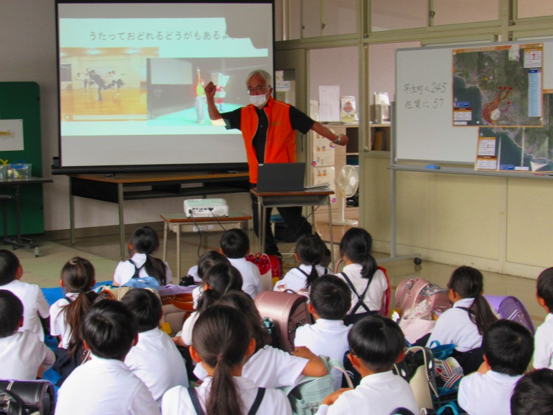 防災士 濵村一男先生より、「土砂災害から逃げよう!」というテーマでお話をいただきました。山口県は、土砂災害警戒区域の数が日本で5番目に多く、平生町には245か所、佐賀にも57か所もあるそうです。